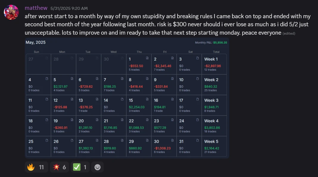 "I was trading like a degenerate for nine months—my wins weren't very big because anytime I was up something, I'd lock it in, but it never added up to how much I was losing. After a year I had nothing to show. Then I committed to Clover Trading's education—watching all the webinars, video lessons, studying the patterns—and that's when things finally clicked. I built my foundation on the patterns you guys teach."